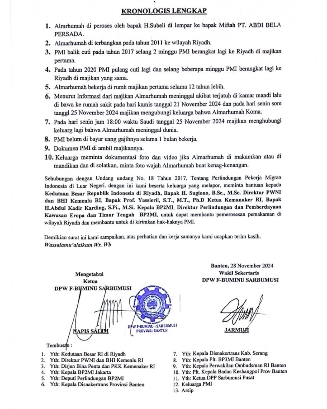 ” Sekitar Tahun 2021/2022 Saya mengantarkan istri saya Almarhumah Fadilah ke bandara soekarno hata untuk berangkat bekerja ke Arab Saudi riyad, namun saya tidak pernah memberi ijin tertulis atas keberangkatan istri Saya Almarhumah Fadilah untuk bekerja Ke Arab Saudi sebagai Pembantu Rumah Tangga tersebut, dan yang pertama memberangkatkan Almarhumah fadilah adalah Sponsor iroh, dan pemberangkatan ke dua Sponsor H.Subeli Cikeli Tanara yakni pada Tahun 2011,dan Kemungkinan yang memberi ijin tertulis adalah Jaim mantan suami Almarhumah Fadilah, adapun pemberangkatan yang terakhir ini sekitar Tahun 2021/2022 adalah karena cuti bekerja dari majikan yang ada di Arab Saudi ” Ungkapnya (17/01/2025)