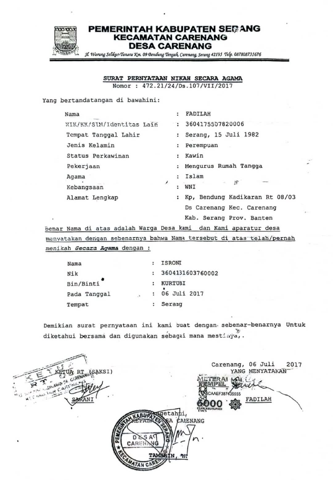 Ditempat terpisah Tambrin Mantan Kepala Desa (Kades) Carenang yang menjabat pada Tahun 2017 ketika dikonfirmasi volunteer news.co.id terkait adanya Surat keterangan nikah secara Agama antara isroni dengan Fadilah mengatakan bahwa Fadilah bersama Isroni suami sirinya meminta kepada pihak Pemerintahan Desa Carenang Kecamatan Carenang Kabupaten Serang, Banten untuk dibuatkan Surat keterangan nikah secara agama