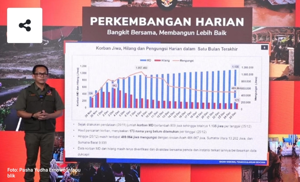 Kepala Pusat Data, Informasi, dan Komunikasi Kebencanaan Badan Nasional Penanggulangan Bencana (BNPB), Abdul Muhari, menegaskan bahwa percepatan pemulihan infrastruktur darat menjadi kunci untuk menekan jumlah pengungsi sekaligus memastikan distribusi bantuan dan logistik berjalan lancar ke wilayah terdampak.