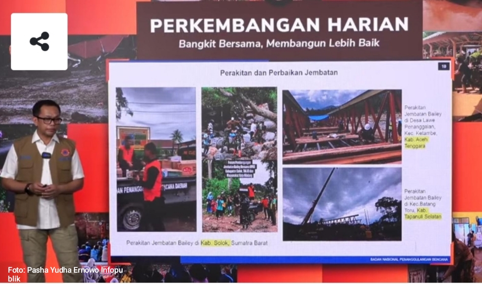 “Tim di lapangan bekerja terus, tidak berhenti di akhir pekan maupun malam hari. Ini bukti keseriusan pemerintah bersama pemerintah daerah dan seluruh pihak terkait untuk mempercepat pemulihan,” ujar Abdul Muhari dalam pemaparan perkembangan penanganan pascabencana, Sabtu (27/12/2025).