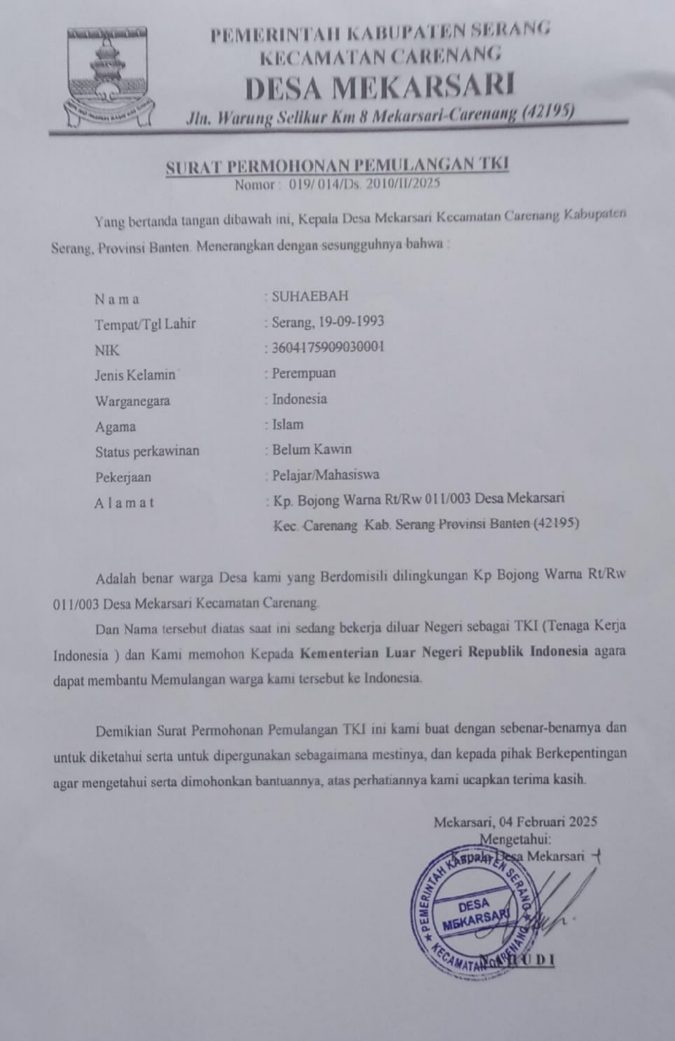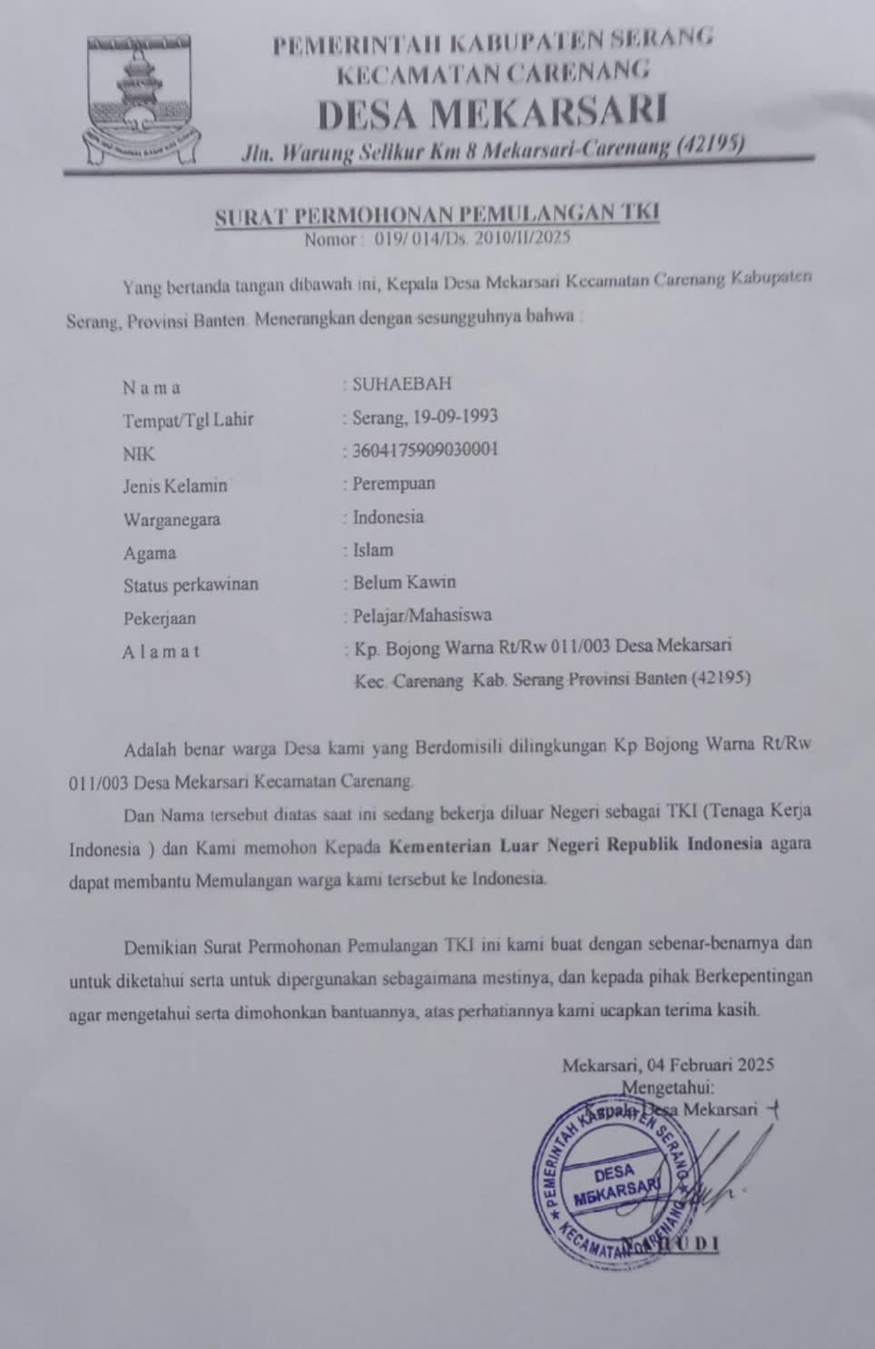 ” Kami berharap dan meminta bantuan Kepada Pemerintah Republik Indonesia, dalam hal ini Bapak Presiden RI H.Prabowo Subianto, Menteri P2MI RI, B3MI Banten dan semua pihak agar dapat memulangkan putri saya Suhaebah, ” Ucapnya sambil meneteskan air kesedihan