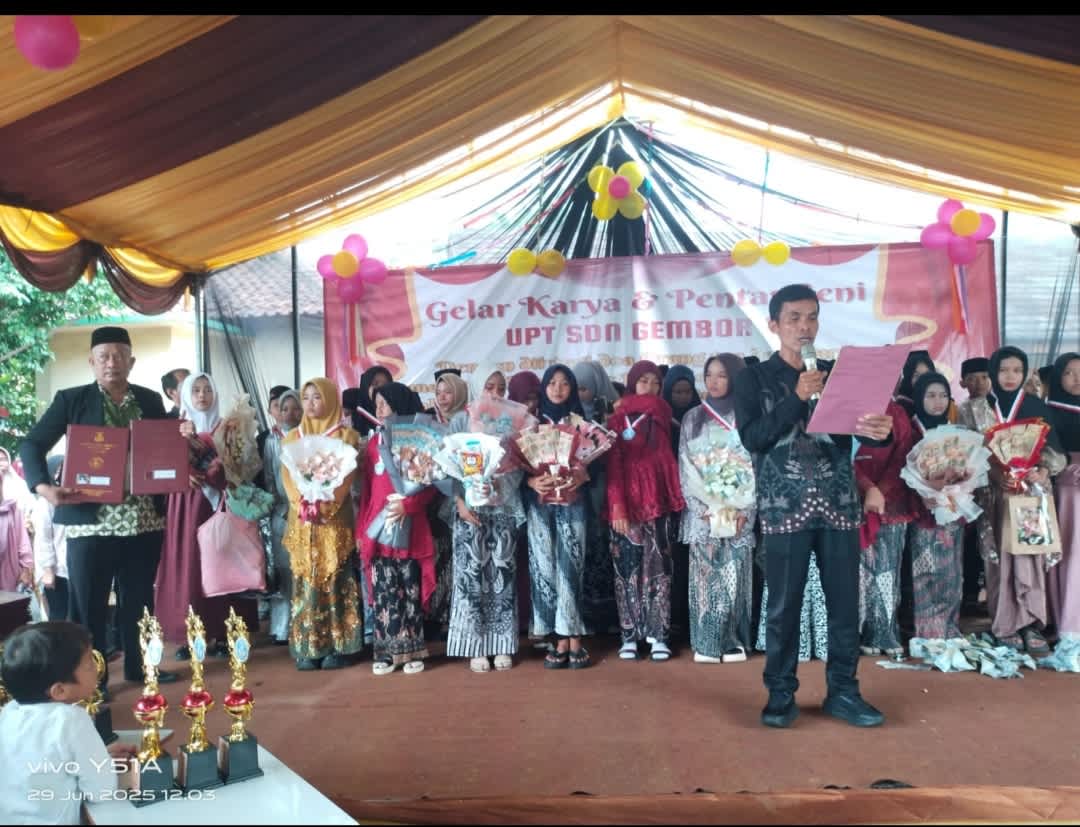 Kab.Serang ; Dengan iringan doa orang tua siswa dan guru guna menumbuhkan kreatifitas seni peserta didik dalam melestarikan budaya Nusantara, Unit Pelaksana Teknis (UPT) Sekolah Dasar Negeri (SDN) Gembor 2 yang berlokasi di Kampung Kibin, Desa Gembor, Kecamatan Binuang, Kabupaten Serang, Banten. menggelar acara pelepasan kelas 6 dan pentas seni serta gelar karya siswa-siswi tahun ajaran 2024/2025.