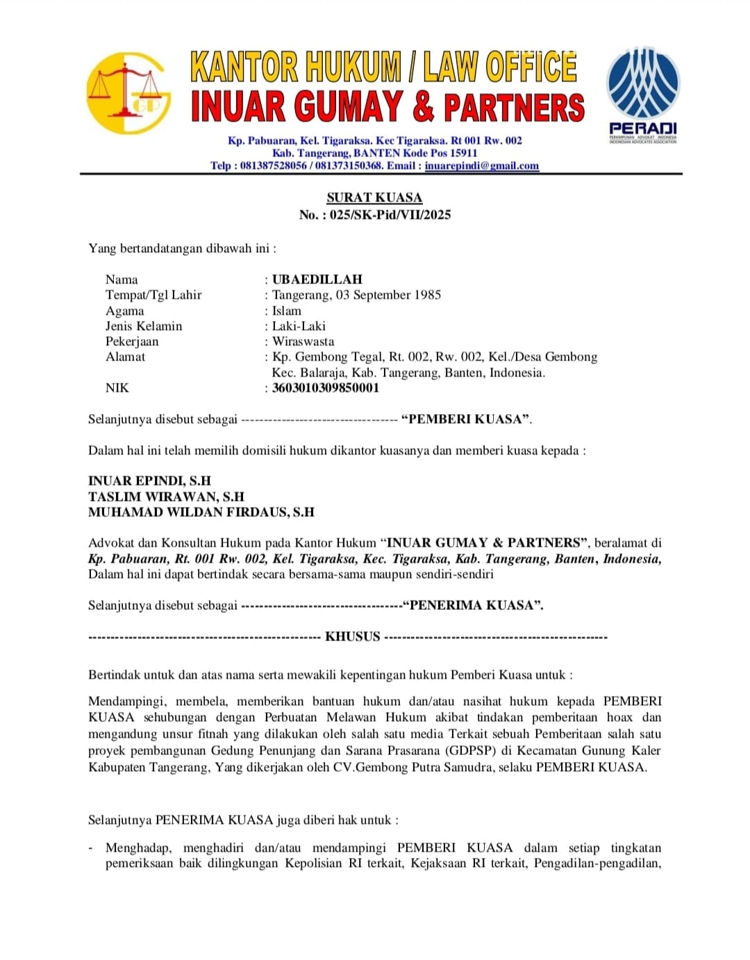 Kab.Tangerang ; Ramainya pemberitaan di media online atas Pernyataan inuar Epindi,S.H yang mengaku selaku Advokat atau Kuasa Hukum dari Ubaedillah Selaku Kontraktor CV.Gembong Putra Samudra, dimana dalam pernyataannya inuar Epindi yang dikutip dari media online Tangerang dalam berita.id dengan judul berita ” Terkait adanya Statement Oknum Lembaga pada Pemberitaan Menjurus Fitnah, Pemilik CV.Gembong Putra Samudra Upayakan Jalur Hukum ” Dimana Inuar Gumay atau Inuar Epindi, S.H mengatakan bahwa dirinya mengaku selaku Kuasa Hukum dari Pemilik CV.Gembong Putra Samudra, yang mana diduga Surat Kuasa Khusus dari pemberi Kuasa Ubaedillah itu cacat formil atau batal demi hukum hal itu dikarenakan hingga malam ini tertanggal 6 Juli 2025 diduga Surat kuasa khusus tersebut belum ditanda tangani oleh pemberi kuasa ( Ubaedillah red ), namun Inuar Epindi,S.H sudah bertindak sebagai penerima Kuasa Khusus Ubaedillah, dengan berstatement di Media online, yang dimana dalam Statement tersebut diduga mengandung unsur pengancaman terhadap salah satu lembaga dan media online