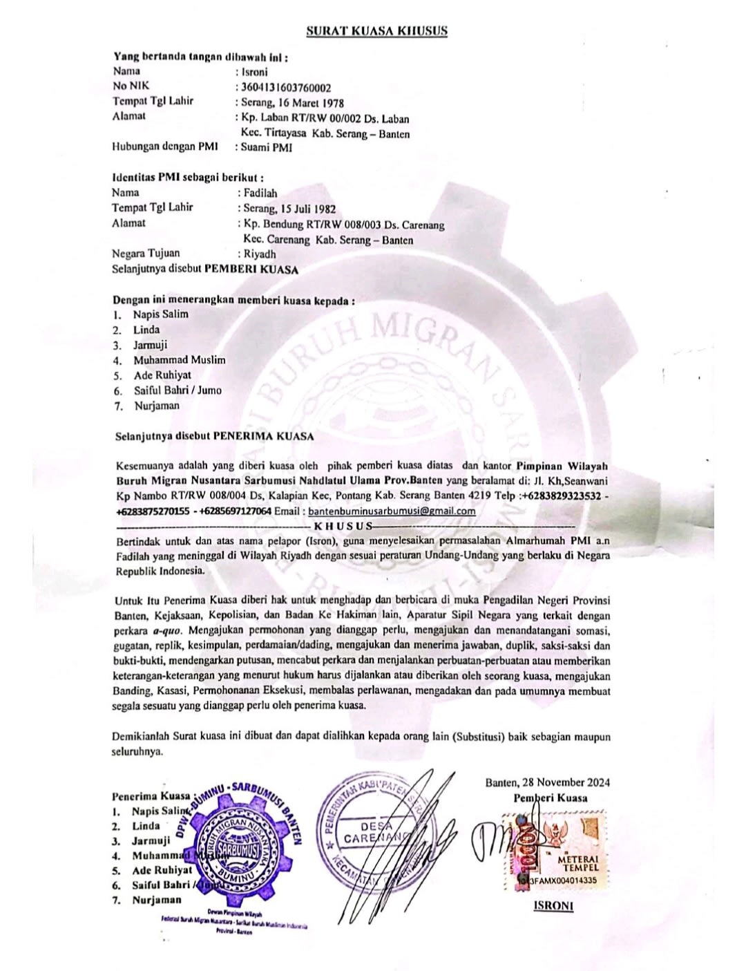 Dari data dan informasi yang dihimpun Volunteer news.co.id bahwa Isroni yang diduga mengaku-ngaku suami Almarhumah Fadilah binti Patani telah memberikan surat kuasa Khusus kepada F Buminu Sarbumusi Nu DPW Provinsi Banten untuk pengurusan jenazah Almarhumah Fadilah binti Patani yang meninggal di Arab Saudi pada November 2024, selanjutnya F-Buminu Sarbumusi Nu berdasarkan surat kuasa khusus dari Isroni tersebut melakukan pengurusan jenazah Almarhumah Fadilah dengan melengkapi persyaratan dan dokumen untuk pemakaman Almarhumah Fadilah binti Patani Yatno di Arab saudi, dan telah melayangkan surat kepada para pihak dan instansi terkait.