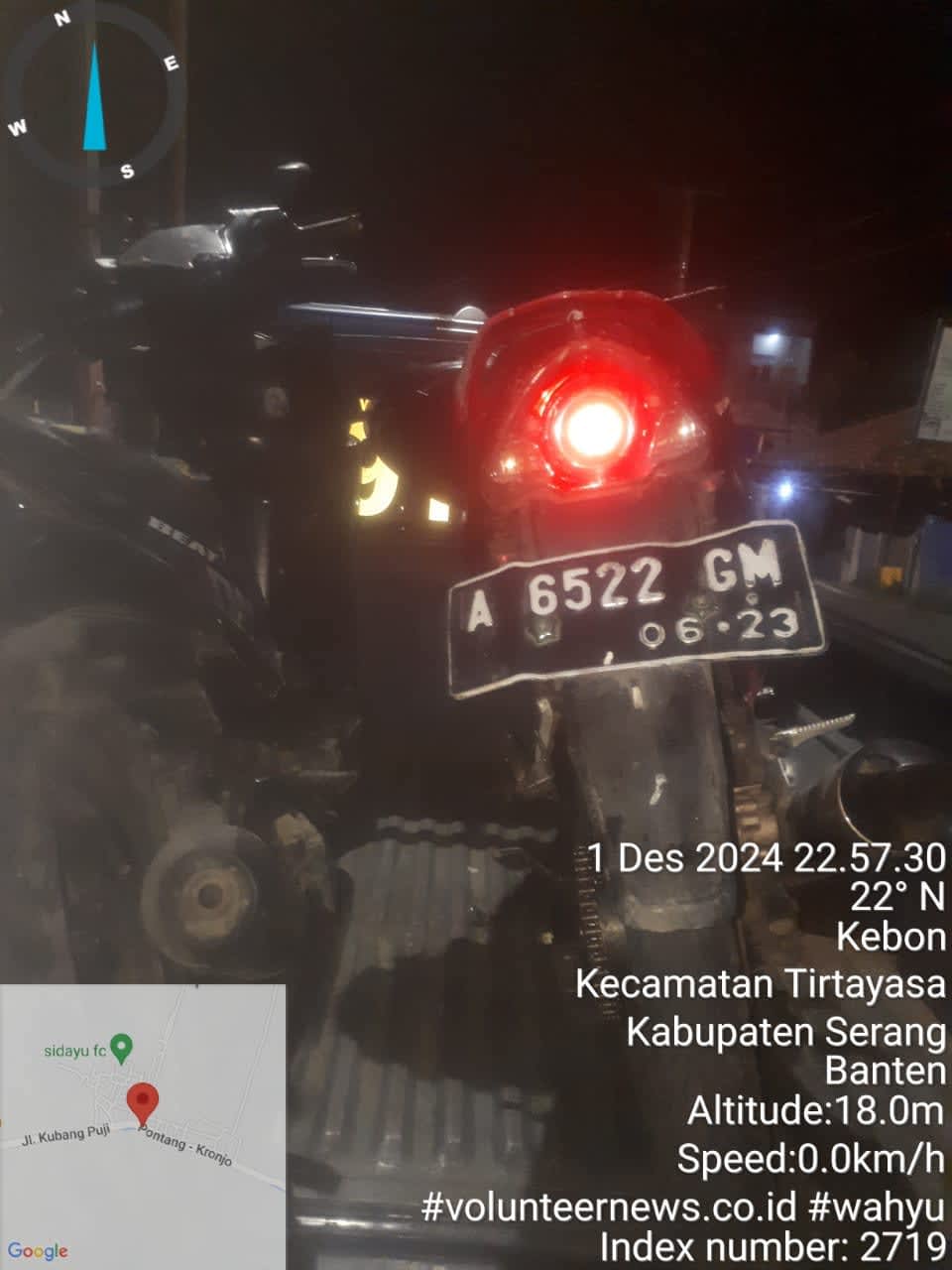 Kendaraan Roda Beat nopol A 4752 TR yang di kendarai warga lontar kecamatan Tirtayasa Kabupaten Serang Banten saat melintas di jalan arah pontang sekira pukul 22: 00 Wib hingga tabrakan tidak bisa dihindari antara motor Beat nopol A 4752 TR dengan motor satria dari arah pontang dengan Nopol : A 6522 GM akibatkan korban bolita di larikan ke klinik terdeka