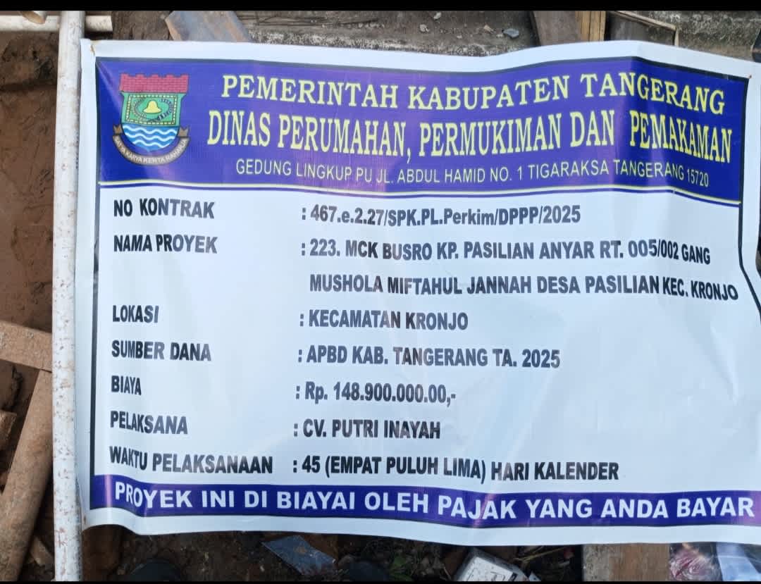 Kab.Tangerang ; Proyek pembangunan Mandi, Cuci Kakus (MCK) Busro yang berlokasi di Kampung Pasilian Anyar RT.05/02 Desa Pasilian Kecamatan Kronjo Kabupaten Tangerang Provinsi Banten dari Dinas Perumahan, Permukiman dan Pemakaman (DPPP) Kabupaten Tangerang dengan nilai pagu anggaran sebesar Rp.148,900, 000,- yang bersumber dari Anggaran Pendapatan Belanja Daerah (APBD) Kabupaten Tangerang Tahun 2025 dimana saat ini sedang dikerjakan oleh CV. Putri Inayah selaku kontraktor pelaksana proyek, yang mana warga berharap adanya pengawasan dari semua pihak agar apa yang menjadi harapan bersama dalam mewujudkan kualitas hasil pembangunan di Kabupaten Tangerang dapat terwujud