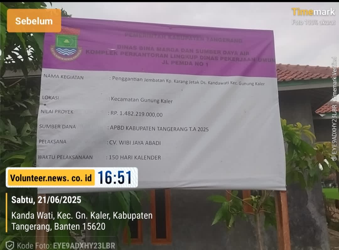 Kab.Tangerang ; Paket pekerjaan proyek pergantian jembatan Kampung Karang Jetak Desa Kandawati Kecamatan Gunung Kaler Kabupaten Tangerang Provinsi Banten dari Dinas Bina Marga dan Sumber Daya Air (DBMSDA) Kabupaten Tangerang dengan nilai anggaran sebesar Rp.1,482,219,000, – (Satu Milyar empat ratus delapan puluh dua juta dua ratus sembilan belas ribu rupiah) yang bersumber dari Anggaran Pendapatan Belanja Daerah (APBD) Kabupaten Tangerang Tahun 2025 , dimana saat ini proyek tersebut mulai dikerjakan oleh CV.Wibi Jaya Abadi selaku kontraktor pelaksana Proyek