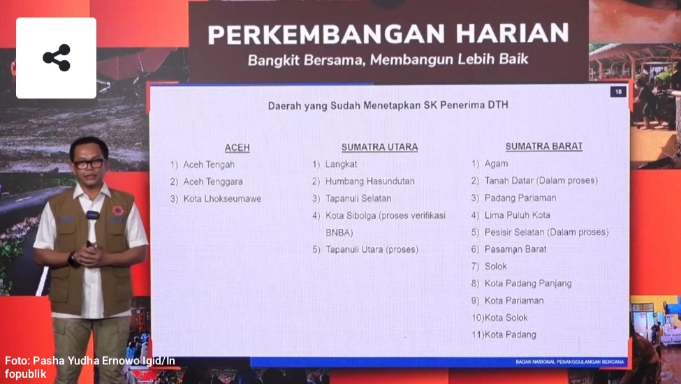 Kepala Pusat Data, Informasi, dan Komunikasi Kebencanaan Badan Nasional Penanggulangan Bencana (BNPB), Abdul Muhari, menegaskan bahwa pemerintah pusat bersama pemerintah daerah bekerja tanpa jeda guna mempercepat penanganan pascabencana di tiga provinsi terdampak.