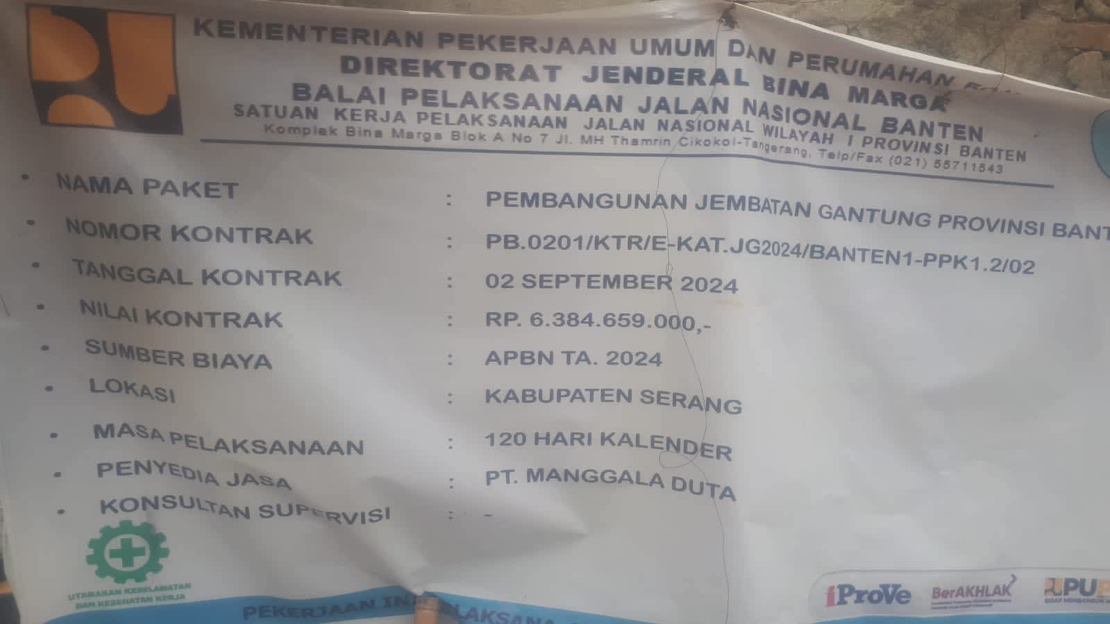 Banten ; Kegiatan Kementrian Pekerjaan Umum Dan Perumahan Rakyat Direktorat Jendral Bina Marga Balai Pelaksanaan Jalan Nasional Banten Satuan Kerja Jalan Nasional Wilayah 1 Provinsi Banten Nama Paket Pembangunan Jembatan Gantung Provinsi Banten nomor Kontrak PB.0201/KTR/E- KAT.JG 2024./BANTEN 1 – PPK 1.2/02 Tangggal Kontrak 02 September 2024 Nilai Kontrak Rp.6.384.659.000. Sumber Dana APBN Tahun Anggaran 2024 lokasi Kabupaten Serang Masa Pelaksanaan 120 hari Kalender Penyedia Jasa PT.Manggala Duta konsultan Suvervisi