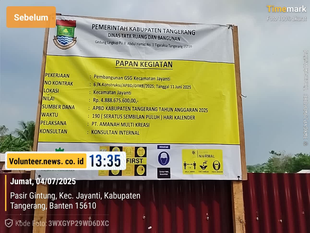Kab.Tangerang ; Paket proyek Pembangunan Gedung Serba Guna (GSG) Kecamatan Jayanti Kabupaten Tangerang Provinsi Banten dari Dinas Tata Ruang dan Bangunan (DTRB) Kabupaten Tangerang dengan nilai anggaran Rp.4,888, 675,000. (Empat Milyar delapan ratus delapan puluh delapan juta enam ratus tujuh puluh lima ribu rupiah) yang bersumber dari Anggaran Pendapatan Belanja Daerah (APBD) Kabupaten Tangerang Tahun 2025, dan selaku kontraktor Pelaksana proyek CV.Amanah Multi Kreasi, yang mana saat ini mulai dikerjakan, dimana nampak para pekerja proyek sedang melakukan pekerjaannya