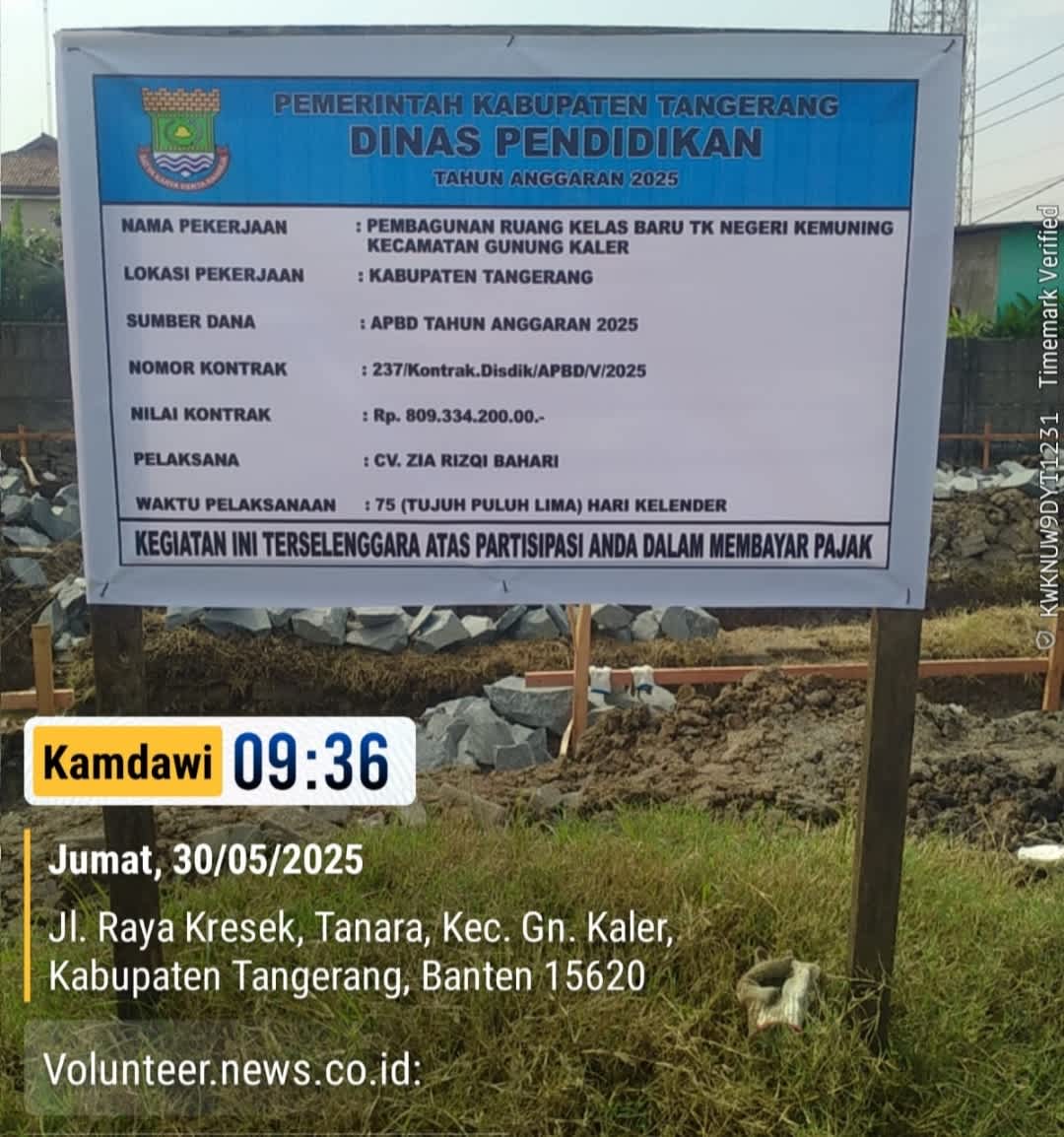 Pemerintah Daerah (Pemda) Kabupaten Tangerang Provinsi Banten melalui Dinas Pendidikan terus memberikan perhatian serius dalam meningkatkan kualitas pendidikan, diantaranya dengan mengalokasikan anggaran untuk pembangunan gedung atau ruang kelas baru PendidikanTaman Kanak-kanak (TK) Negeri Kemuning Kecamatan Gunung Kaler yang mana saat ini proyek Pembangunan tersebut sedang dikerjakan oleh kontraktor pelaksana CV. Zia Rizqi Bahari dengan nilai anggaran sebesar Rp.809, 334,200,- yang bersumber dari Anggaran Pendapatan Belanja Daerah (APBD) Kabupaten Tangerang Tahun 2025